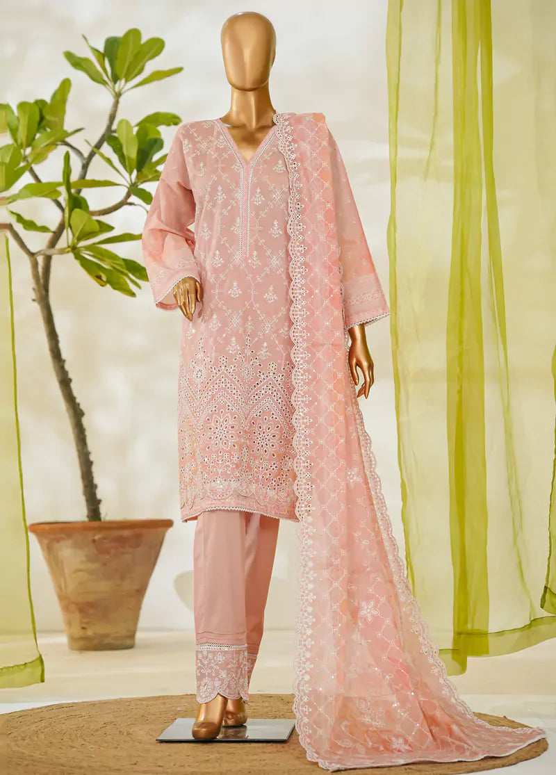 Bin Saeed Fabrics presents a 3-piece stitched embroidered suit in pastel pink, crafted from soft lawn fabric for comfort in warm weather. This traditional and ceremonial outfit includes a lawn shirt, straight lawn trousers, and a matching embroidered dupatta, offering elegant embellishments perfect for special occasions in Pakistan.