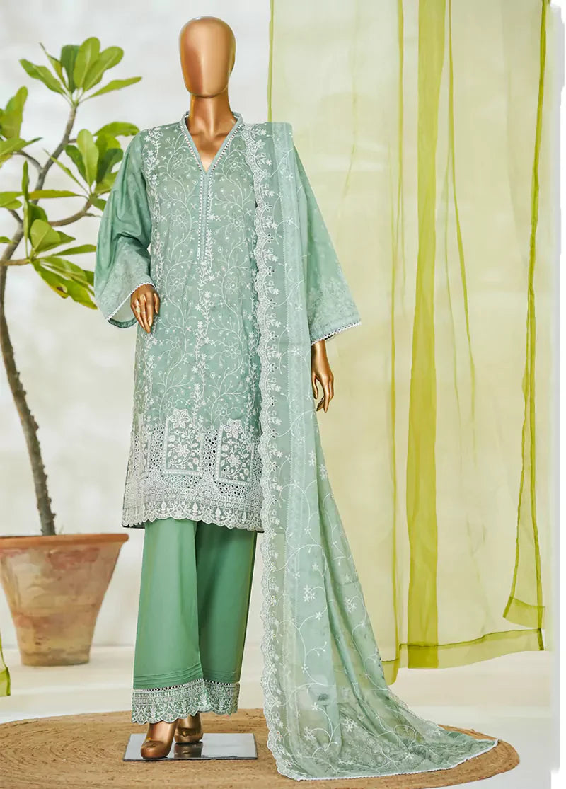 Bin Saeed Fabrics presents a 3-piece stitched embroidered suit in refreshing mint green, crafted from soft lawn fabric for comfort in warm weather. This traditional set includes a straight-cut shirt, matching straight trousers, and a beautifully embellished dupatta, making it ideal for ceremonial occasions in Pakistan.