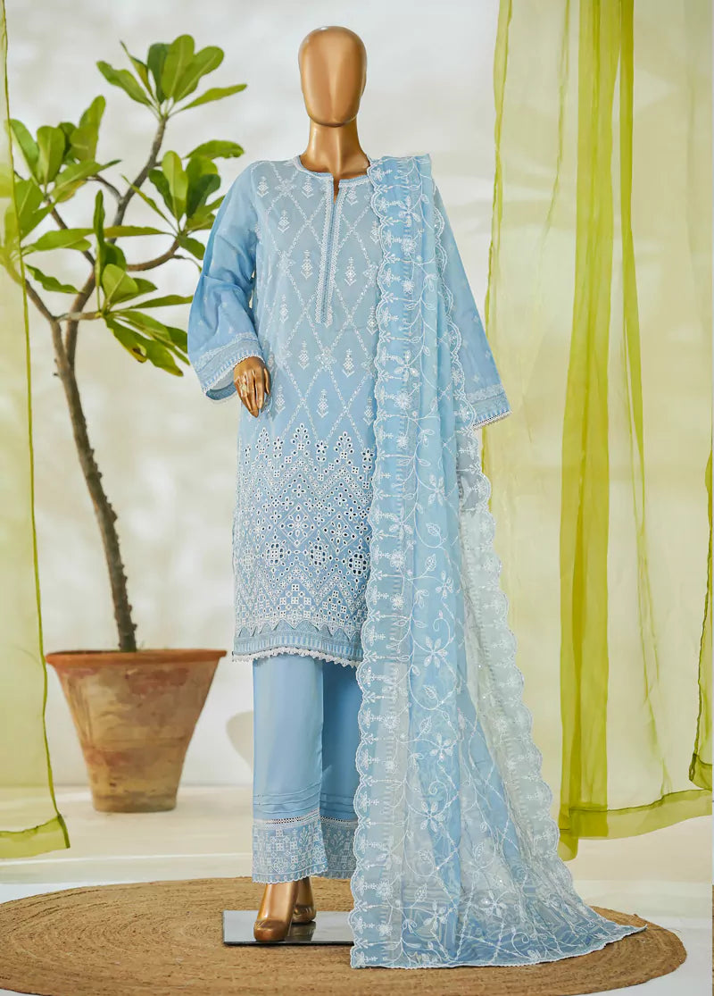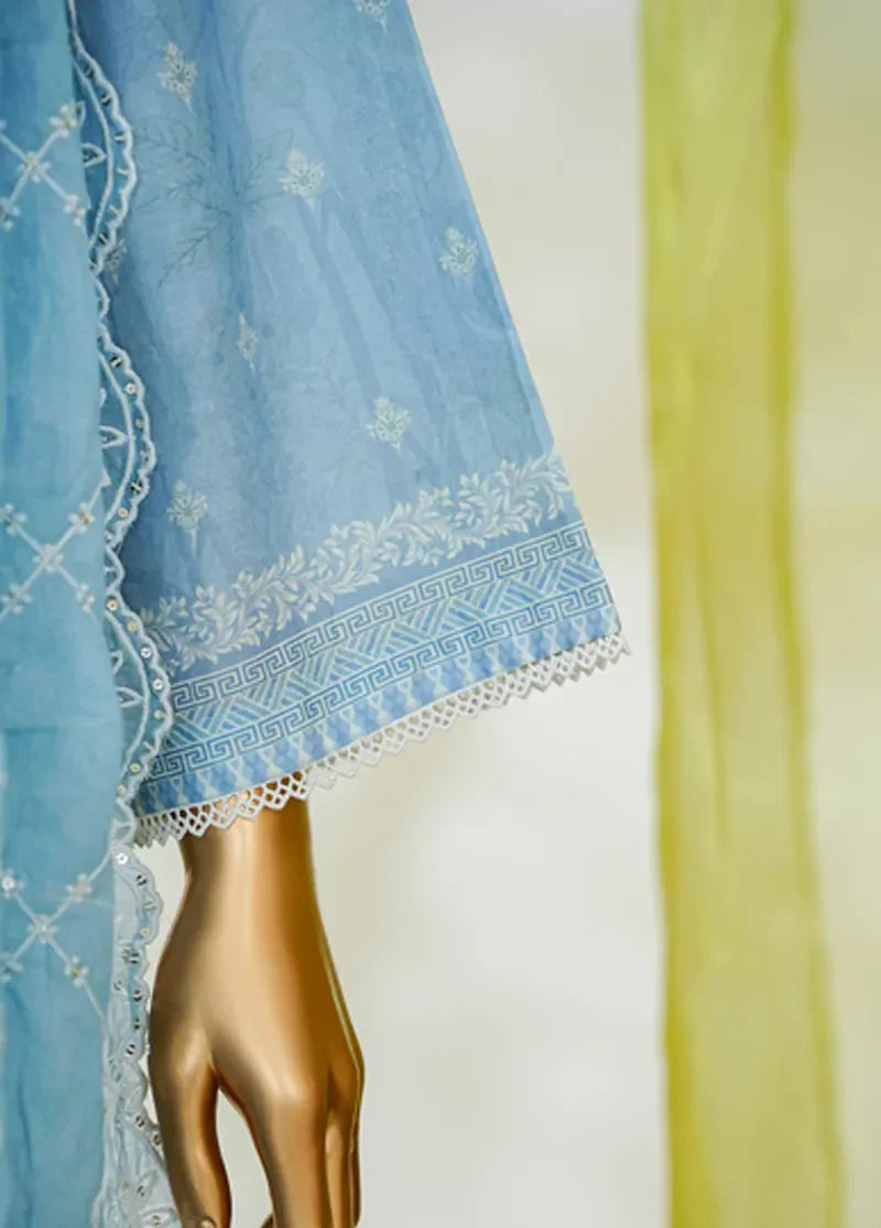 Bin Saeed Fabrics presents a 3-piece stitched embroidered suit in sky blue, crafted from soft lawn fabric for comfort in warm weather. This traditional set includes a straight-cut shirt, matching straight trousers, and a dupatta, all featuring detailed embroidery and embellishments, perfect for ceremonial occasions in Pakistan.