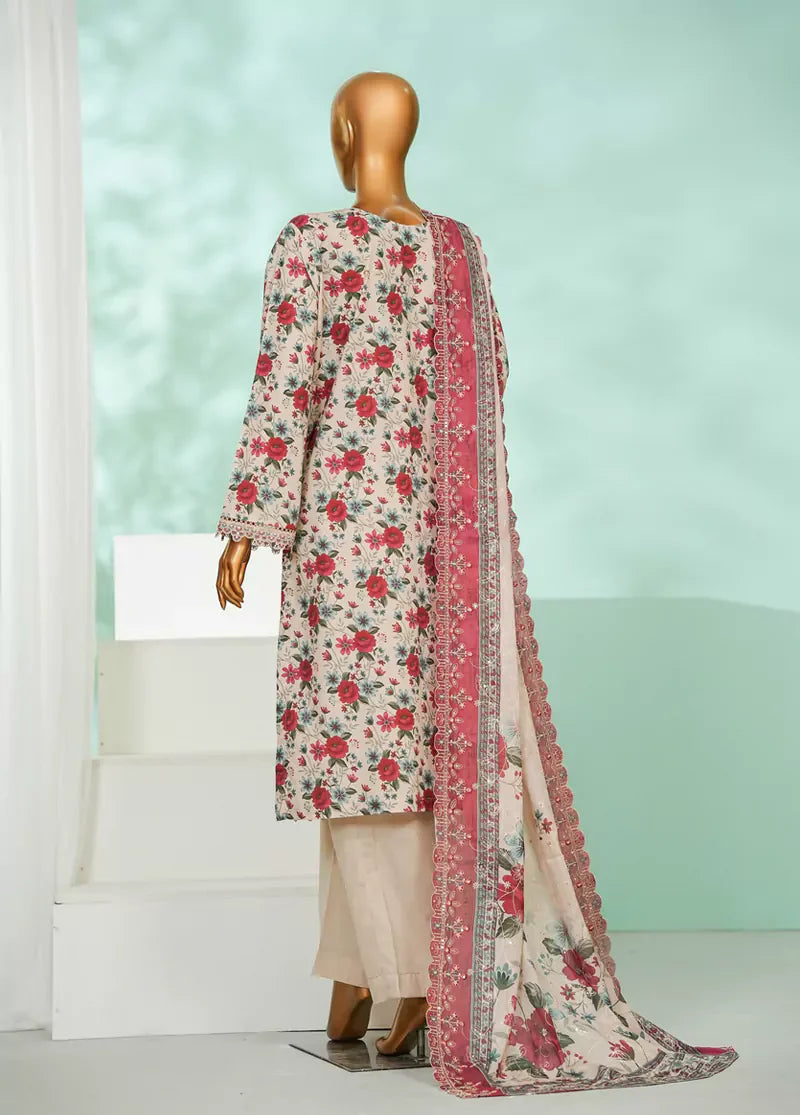 Bin Saeed Fabrics presents a women's 3 Piece Stitched Embroidered Suit featuring a multicolor straight lawn shirt with detailed embroidery, paired with off-white straight lawn trousers for comfort. The matching multicolor lawn dupatta completes this elegant, breathable outfit, perfect for warm weather and everyday wear.