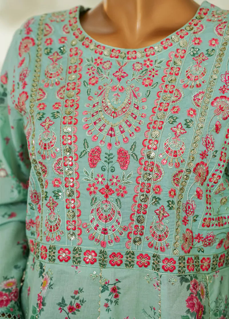 Bin Saeed Fabrics presents a stitched 3 Piece Embroidered Suit in vibrant turquoise. The frock-style shirt, culottes, and matching dupatta are crafted from breathable lawn fabric, ensuring comfort in warm weather. Detailed embroidery adds elegant embellishment, making this suit perfect for stylish, comfortable wear in Pakistan’s climate.