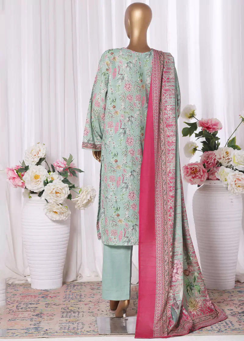 Bin Saeed Fabrics presents a women's 3 Piece Stitched Printed Suit featuring a long mint green khaddar shirt paired with straight mint green khaddar trousers. The multi-color khaddar dupatta complements the set, enhanced with delicate lace work. This comfortable, breathable outfit is ideal for cooler seasons, blending style with everyday...