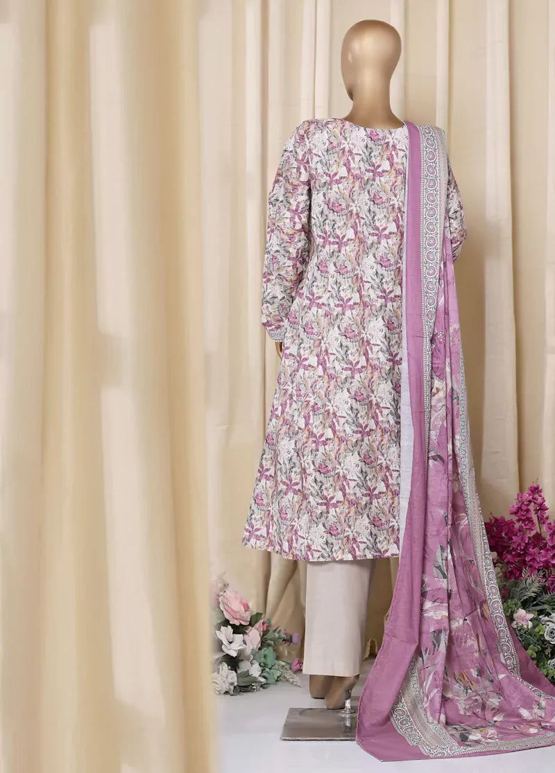 Bin Saeed Fabrics presents a women's 3 Piece Stitched Printed Suit featuring a multicolor khaddar frock shirt with delicate lace work, paired with beige straight khaddar trousers and a matching multicolor khaddar dupatta. This comfortable, breathable outfit is ideal for cooler seasons, offering both style and warmth.