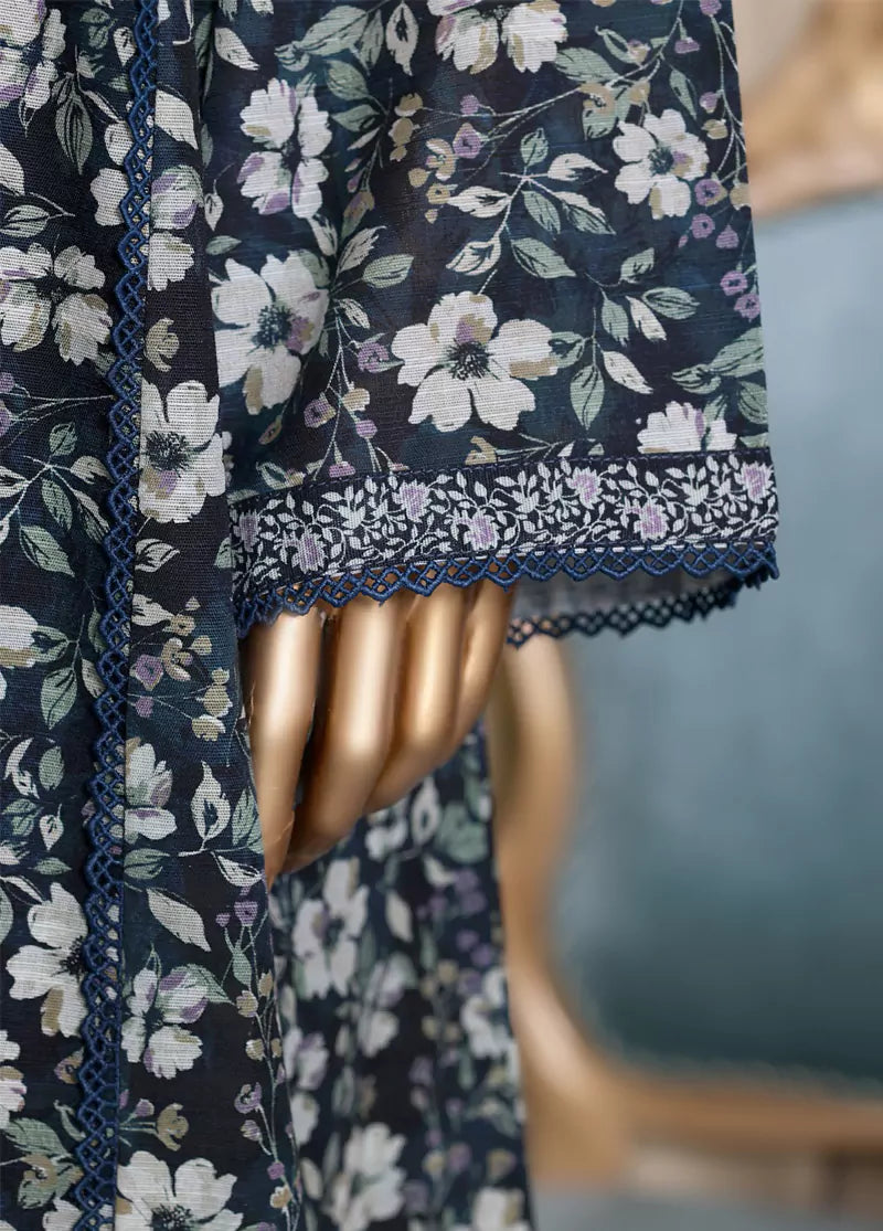 Bin Saeed Fabrics presents a women's 3 Piece Stitched Printed Suit in navy blue, crafted from comfortable Khaddar fabric ideal for cooler seasons. The set includes a frock-style shirt, straight trousers, and a matching dupatta, all featuring delicate lace work for subtle elegance without embroidery.