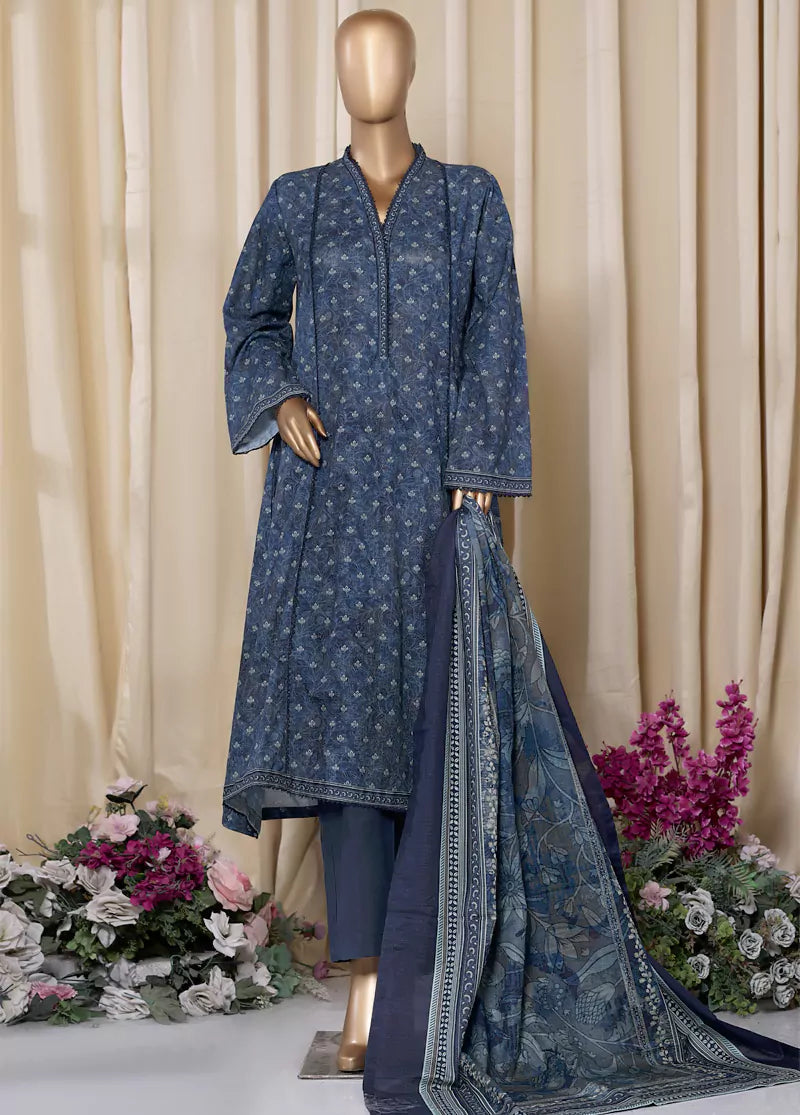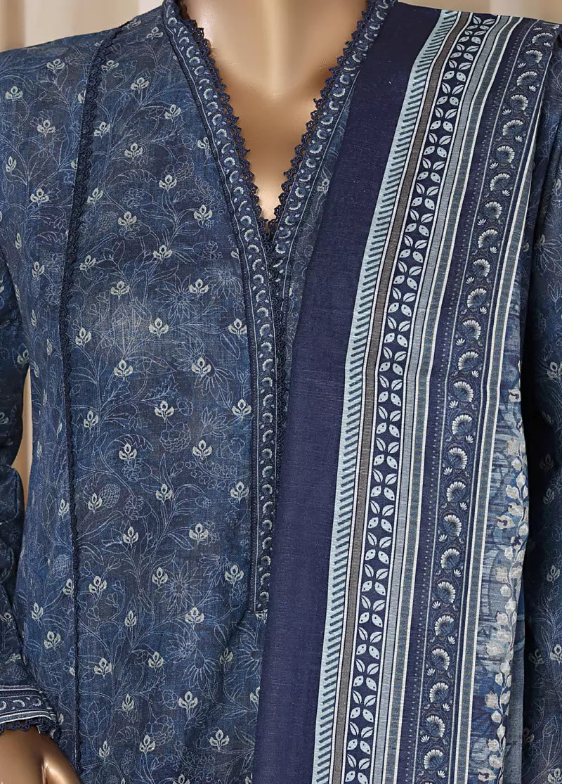 Bin Saeed Fabrics presents a women's 3 Piece Stitched Printed Suit in navy blue, crafted from comfortable Khaddar fabric ideal for cooler seasons. The set includes a frock-style shirt, straight trousers, and a matching dupatta, all featuring delicate lace work for subtle elegance without embroidery.