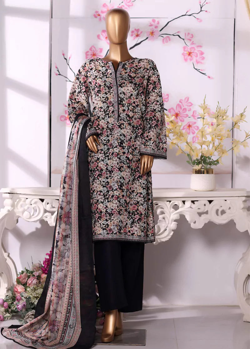Bin Saeed Fabrics presents a women's 3 Piece Stitched Printed Suit featuring a long multicolor khaddar shirt with delicate lace work, paired with black straight khaddar trousers and a matching multicolor khaddar dupatta. This comfortable, breathable outfit is perfect for cooler seasons, combining style and ease for everyday wear.
