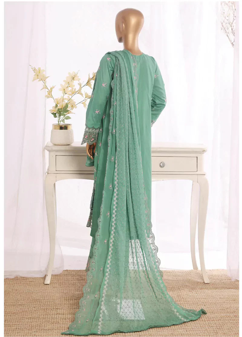 Bin Saeed Fabrics presents a women's 3 Piece Stitched Embroidered Suit in seafoam green, featuring a straight lawn shirt and matching straight lawn trousers for all-day comfort. The chiffon dupatta complements the embroidered embellishments, making this lightweight suit perfect for warm weather and stylish occasions in Pakistan.