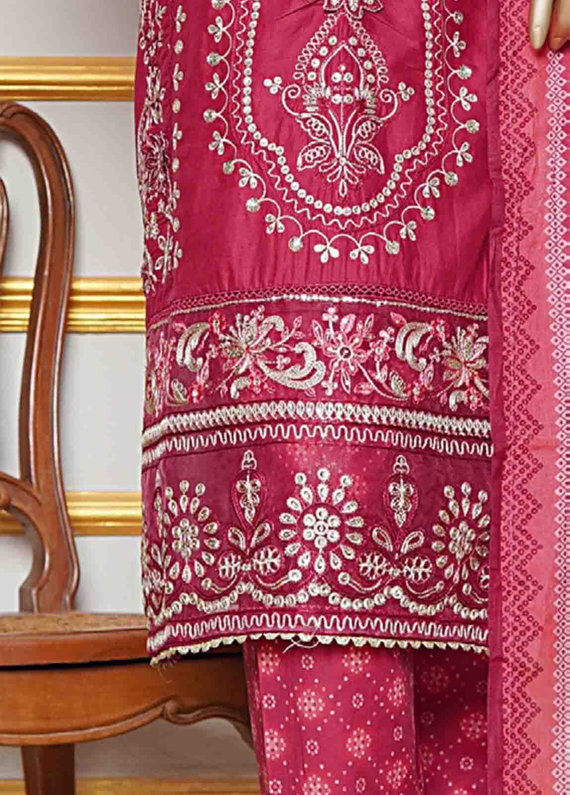 3 Piece Hot Pink Color Embroidered Cotton Stitched Suit with Printed Cotton Dupatta and Printed Trouser