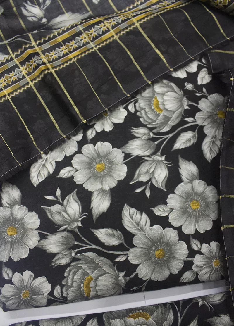 Bin Saeed Fabrics presents a women's 3 Piece UnStitched Digital Printed Suit in black, crafted from soft lawn fabric. This set includes a lawn shirt, trouser, and dupatta, all in black, offering lightweight comfort ideal for warm weather. The unstitched design allows for a custom fit without embroidery or embellishments.