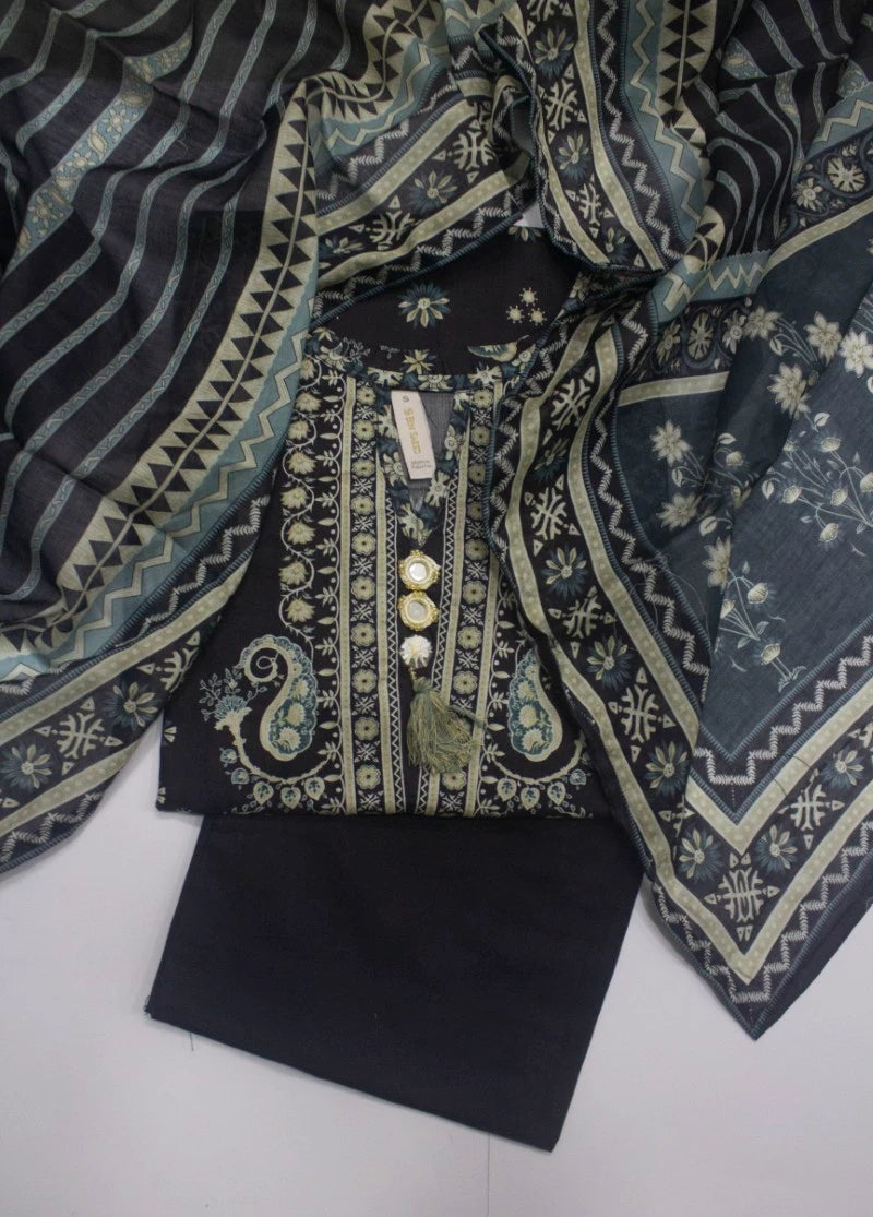 Bin Saeed Fabrics presents a women's 3 Piece Stitched Printed Suit featuring a straight black lawn shirt and matching straight trousers, both crafted from breathable lawn fabric for all-day comfort. The black lawn dupatta complements the set, enhanced with delicate lace work, making it ideal for warm weather wear.