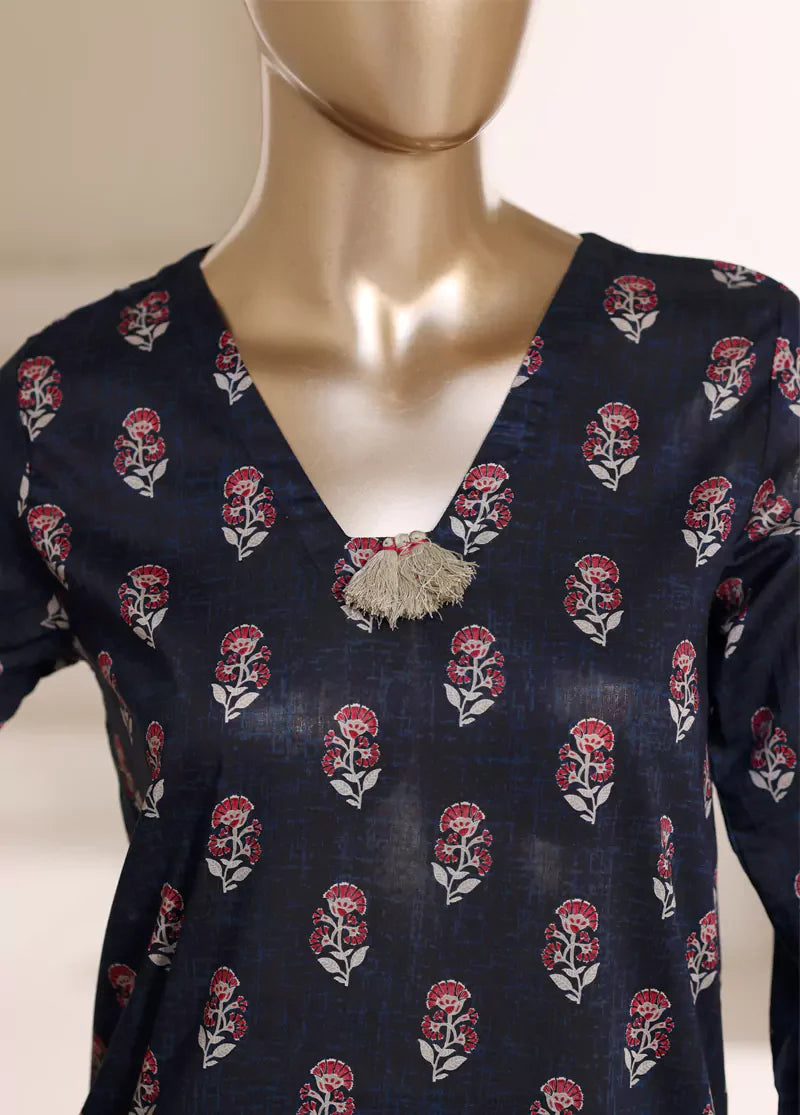 Bin Saeed Fabrics presents a women's 3 Piece Stitched Printed Suit in navy blue, crafted from soft lawn fabric for all-day comfort. This set includes a long shirt with delicate lace work, straight trousers, and a matching dupatta, making it perfect for warm weather and casual wear in Pakistan.