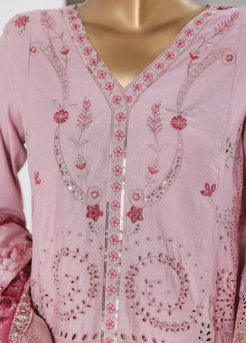 Bin Saeed Fabrics presents a 3-piece stitched embroidered suit in pastel pink, crafted from soft lawn fabric for comfort in warm weather. This traditional set includes a long shirt, straight trousers, and a matching dupatta, all featuring detailed embellishments, perfect for ceremonial occasions in Pakistan.