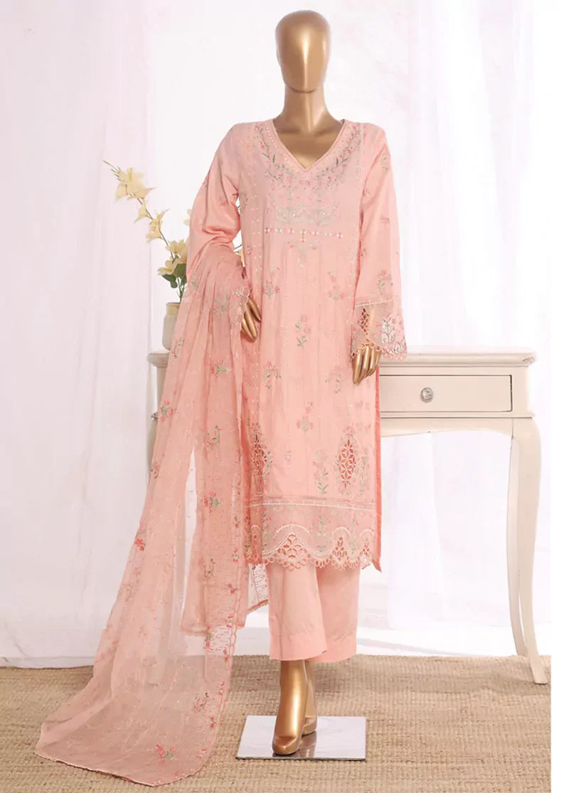 Bin Saeed Fabrics presents a women's 3 Piece Stitched Embroidered Suit in peach, featuring a straight lawn shirt and matching straight lawn trousers for a comfortable fit. The chiffon dupatta complements the embroidered embellishments, making this stitched set ideal for warm weather and everyday wear in Pakistan.