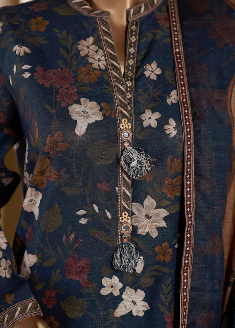 3 Piece Printed Teal Khaddar Shirt with Trouser & Dupatta