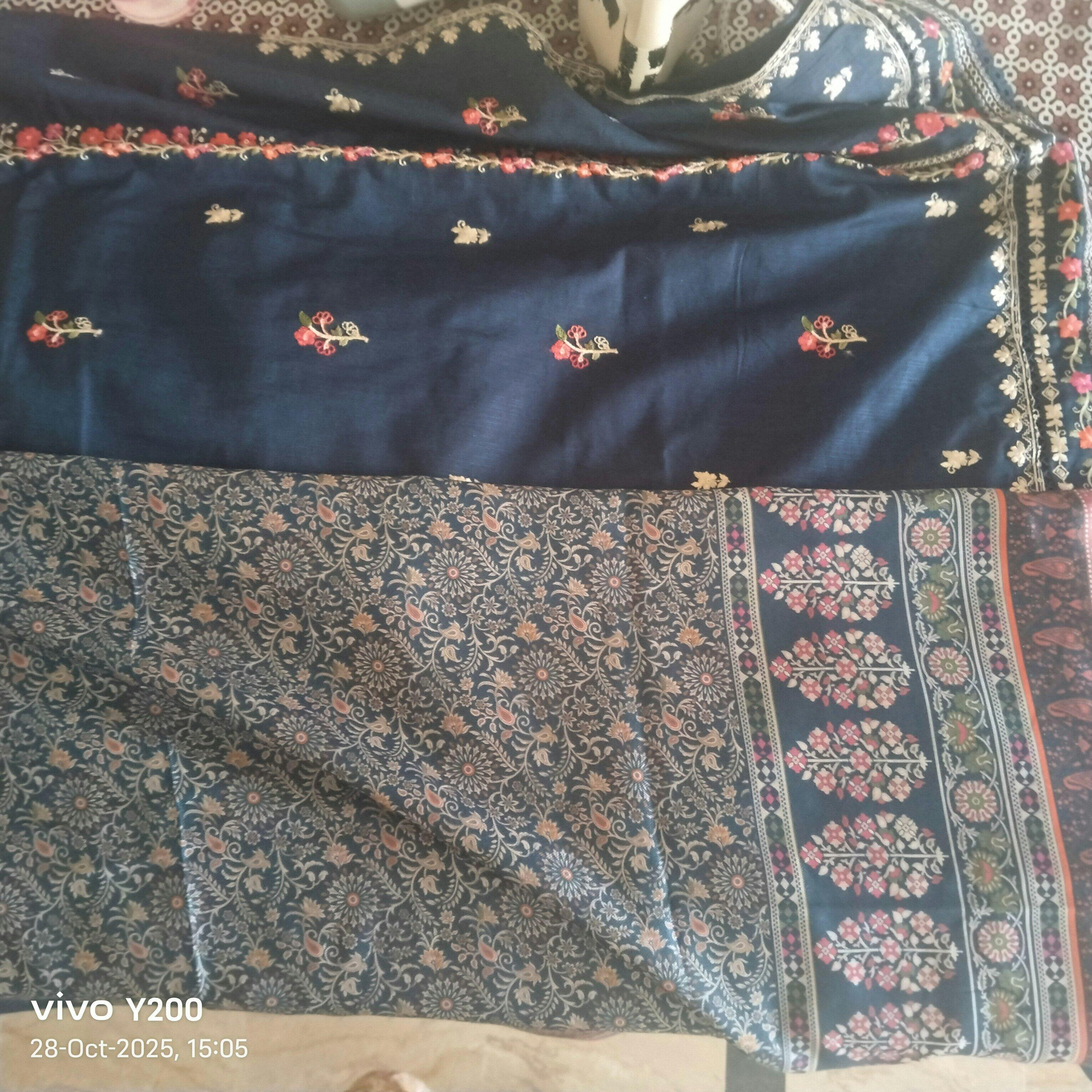 3 Piece Navy Blue Color Embroidered Khaddar Stitched Suit with Khaddar Printed Dupatta and PlainTrouser