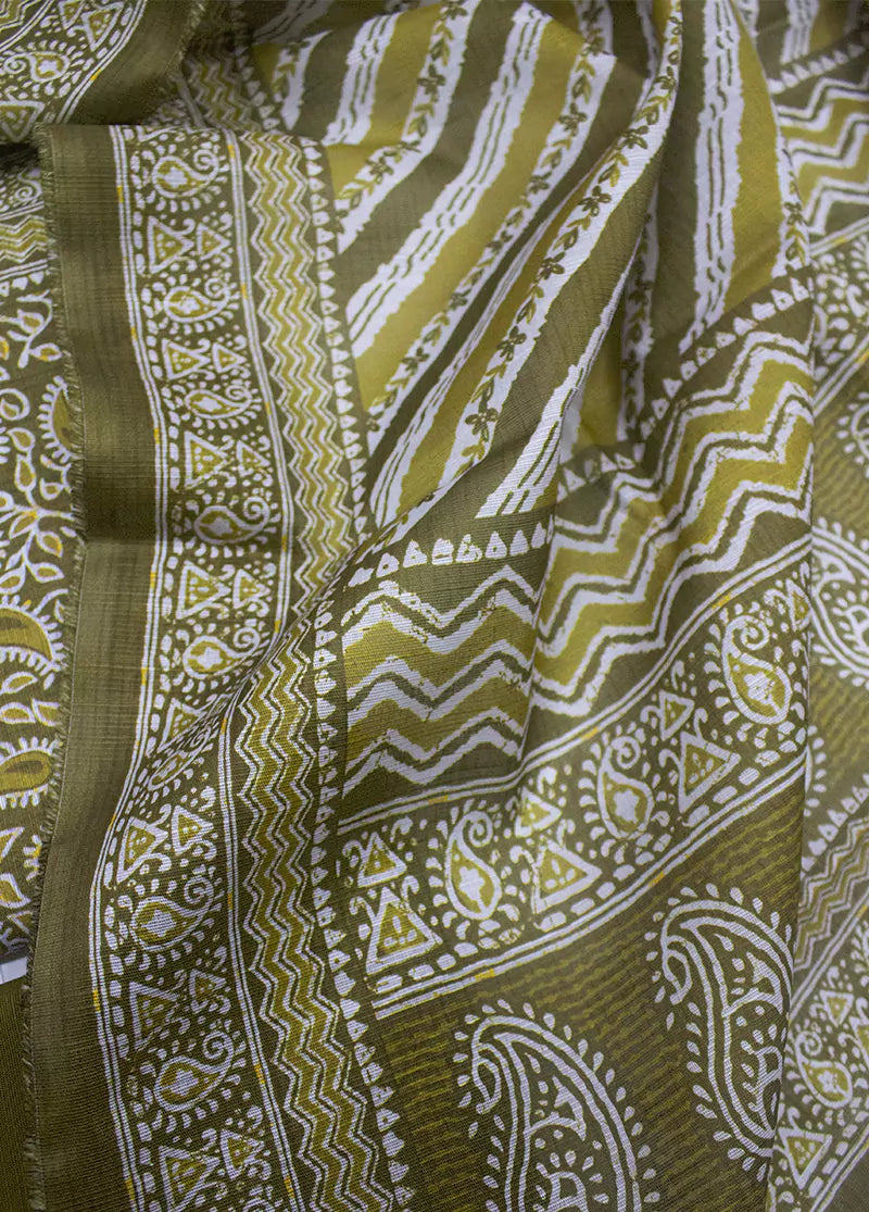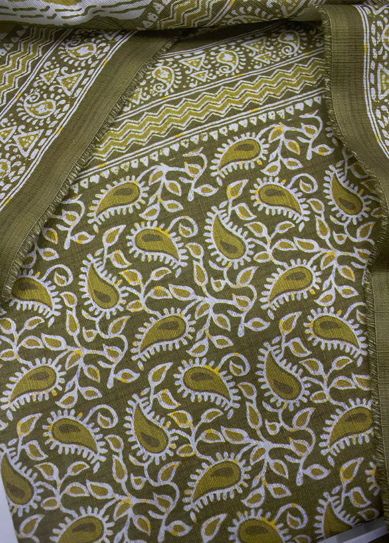 3 Piece Olive Green Color Khaddar Printed UnStitched Suit with Printed Dupatta & Plain Trouser.