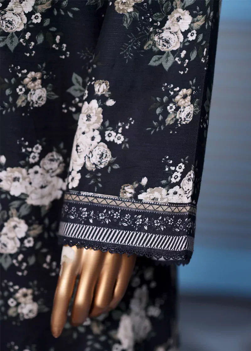 Bin Saeed Fabrics presents a women's 3 Piece Stitched Printed Suit featuring a long black khaddar shirt with delicate lace work, paired with straight black khaddar trousers and a matching black khaddar dupatta. This comfortable, breathable outfit is perfect for cooler seasons, offering a stylish yet simple look without embroidery.