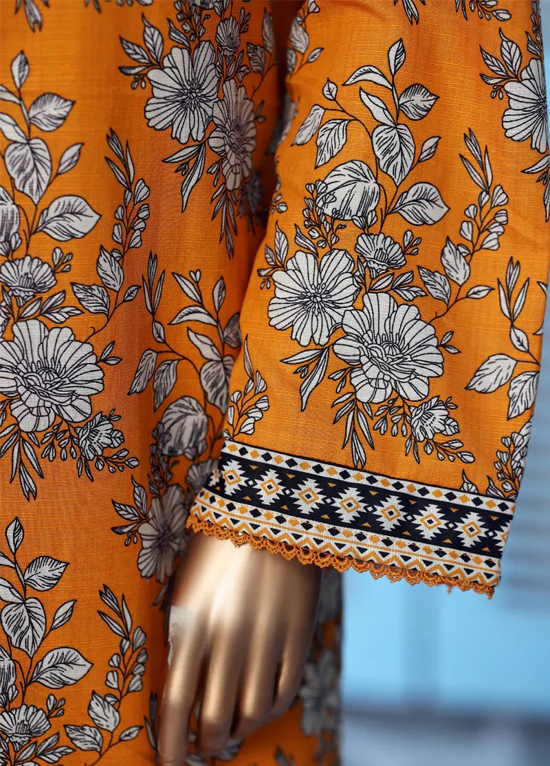 Bin Saeed Fabrics presents a women's 3 Piece Stitched Printed Suit featuring a long orange khaddar shirt and matching straight trousers, paired with a black khaddar dupatta. This comfortable, breathable outfit is perfect for cooler seasons, enhanced with delicate lace work for subtle elegance without embroidery.