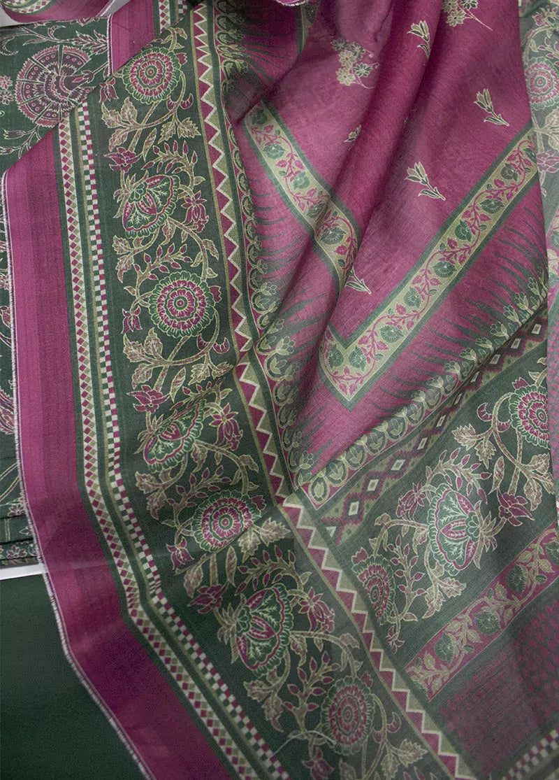 3 Piece Printed Green & Pink Color Unstitched Suit