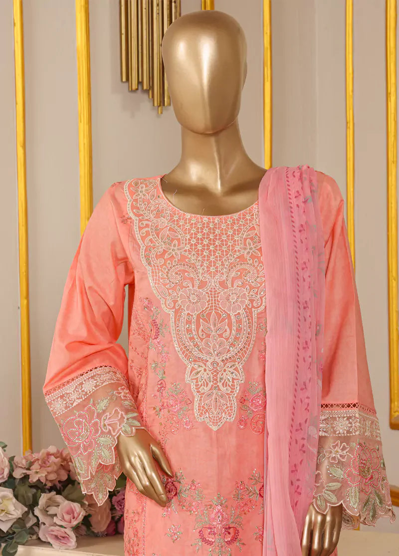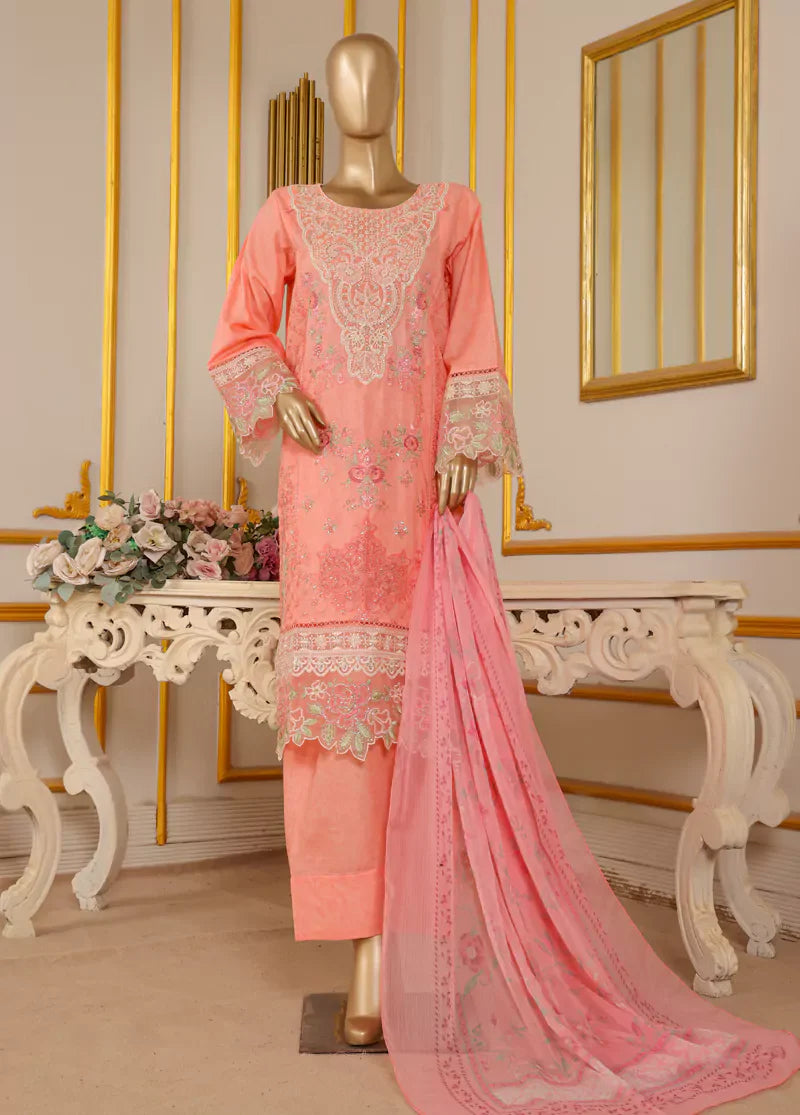 Bin Saeed Fabrics presents a women's 3 Piece Stitched Embroidered Suit in flamingo pink, featuring a long lawn shirt with detailed embroidery and a matching farshi shalwar. The chiffon dupatta complements the set, offering lightweight comfort ideal for warm weather while maintaining elegant style and perfect seasonal fit.