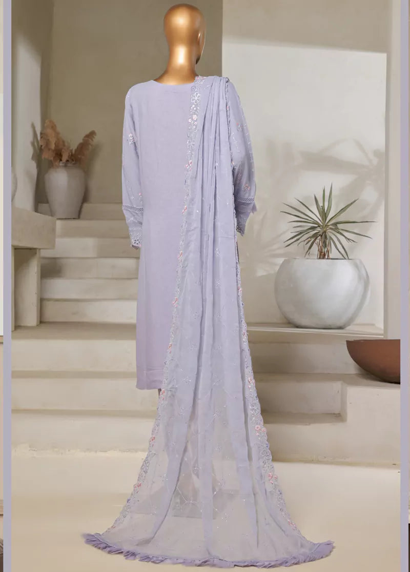 3 Piece Chiffon Lilac Color Stitched Suit with Embroidered Shirt, Embroidered Dupatta & Raw Silk Trouser
