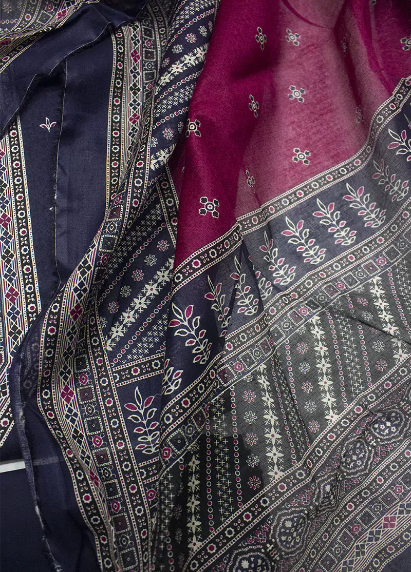 3 Piece Printed Navy Blue Color Unstitched Suit