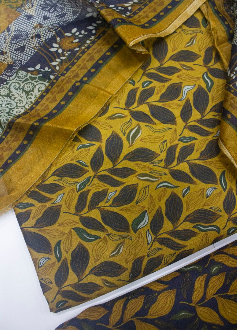 3 Piece Printed Mustard & Blue Color Unstitched Suit