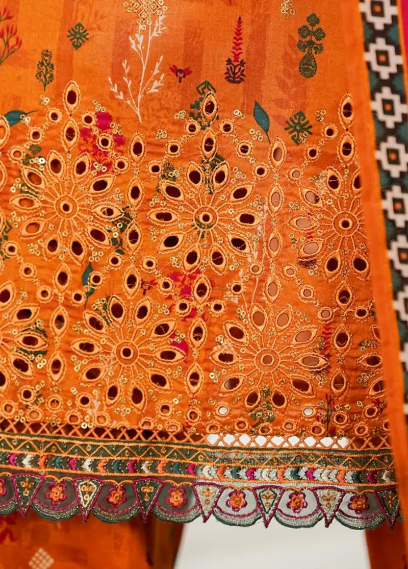 3 Piece Orange Color Embroidered Lawn Shirt with Trouser & Dupatta