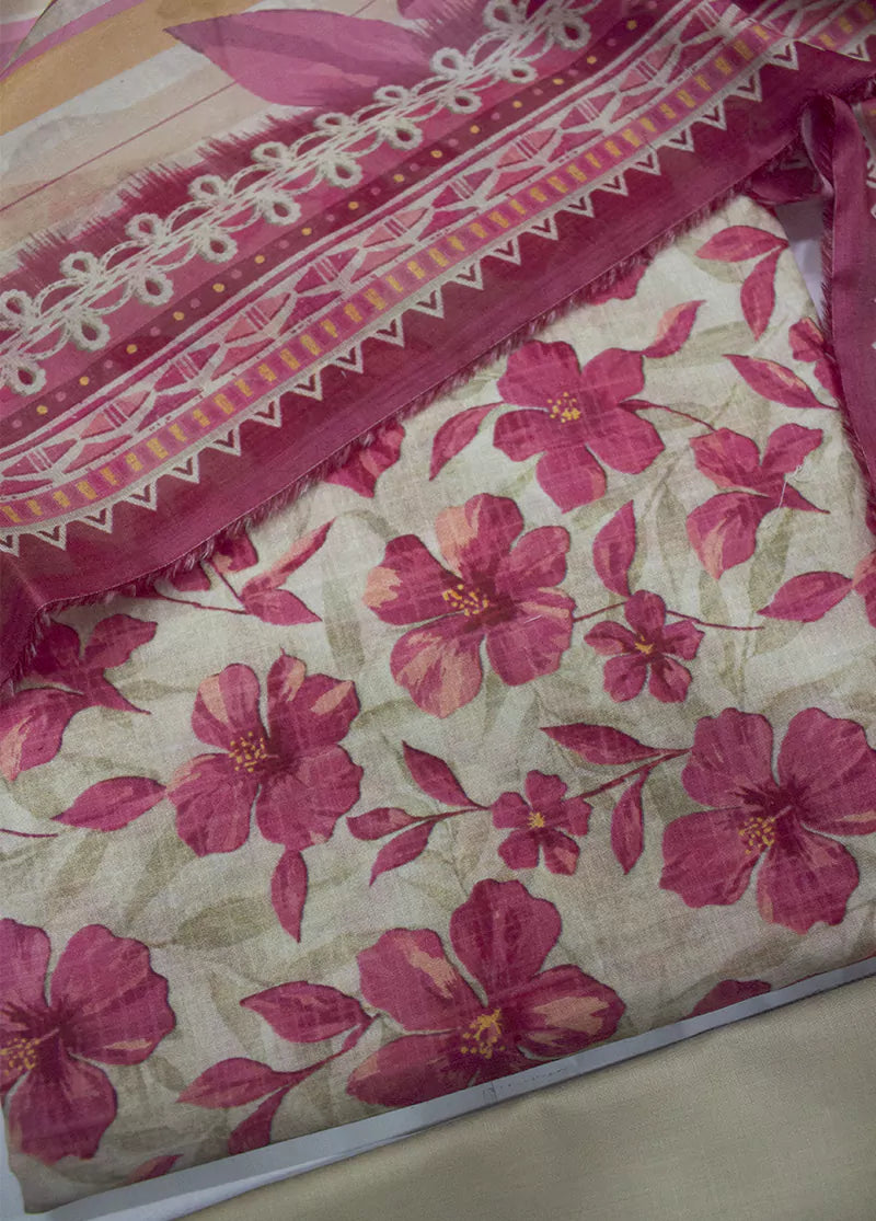 Bin Saeed Fabrics presents a women's 3 Piece UnStitched Digital Printed Suit featuring a multicolor lawn shirt, beige lawn trousers, and a matching multicolor lawn dupatta. Made from lightweight lawn fabric, this suit offers comfort and breathability, perfect for warm weather in Pakistan. The unstitched design allows for custom tailoring.