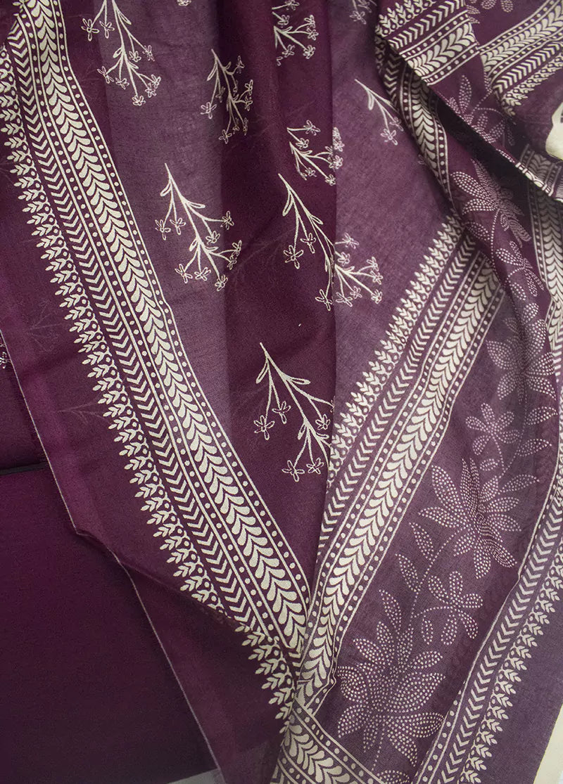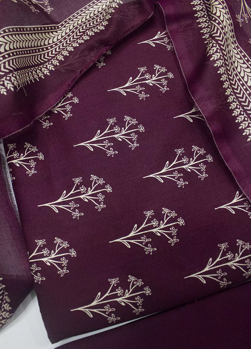 Bin Saeed Fabrics presents a women's 3 Piece UnStitched Digital Printed Suit in maroon, crafted from soft lawn fabric. This comfortable set includes a maroon lawn shirt, matching trousers, and a dupatta, perfect for warm weather. The unstitched design allows for a custom fit, ideal for everyday wear in Pakistan.