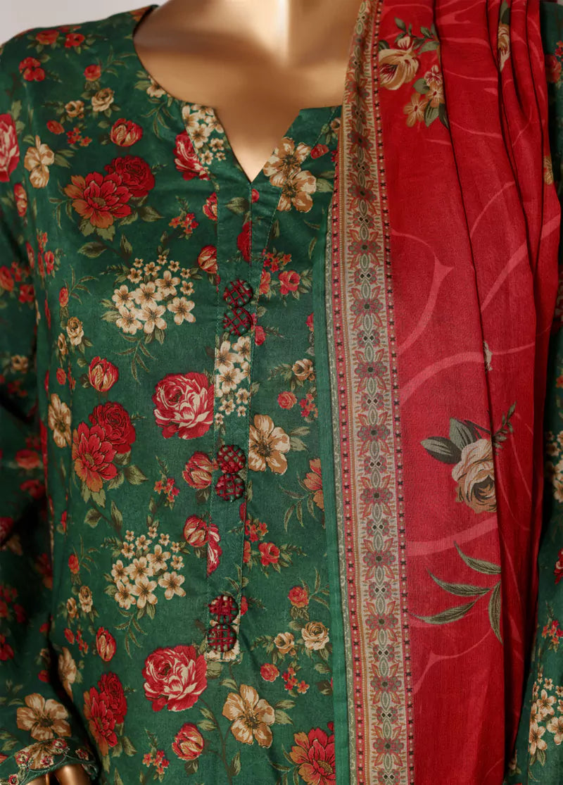 3 Piece Printed Bottle Green Color Lawn Shirt with Trouser & Dupatta