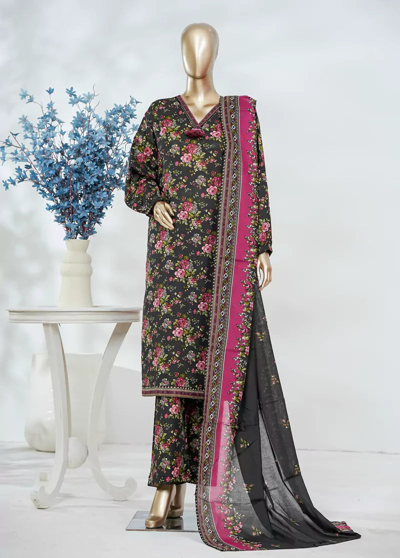 Bin Saeed Fabrics presents a women's 3 Piece UnStitched Digital Printed Suit featuring a multi-color straight shirt, culottes-style trousers, and a matching dupatta, all crafted from breathable lawn fabric. This lightweight set offers comfort and is ideal for warm weather, perfect for creating your own stylish look.