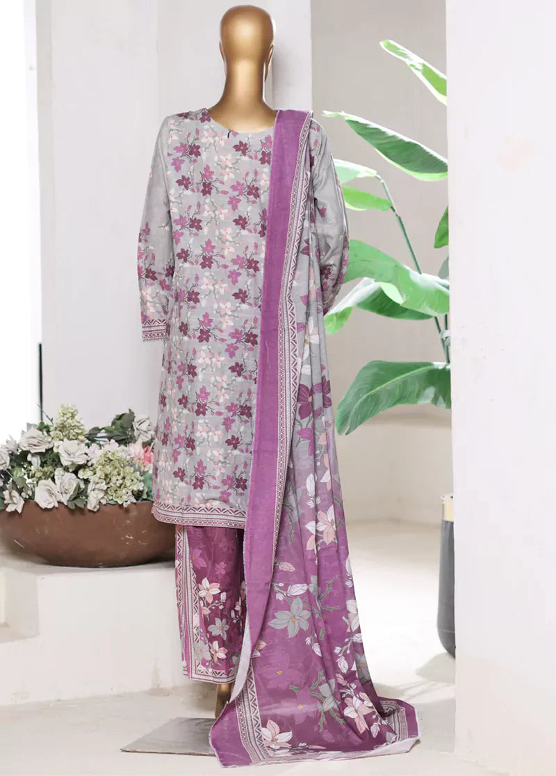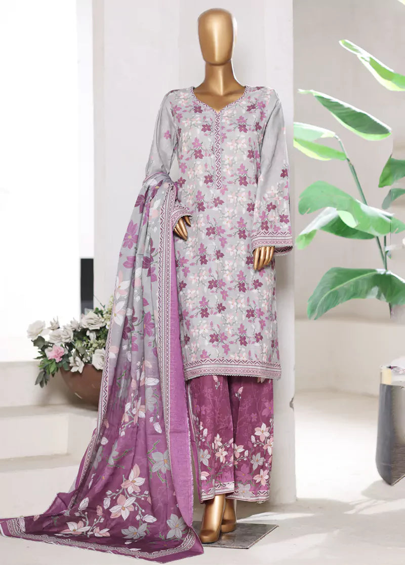 Bin Saeed Fabrics presents a women's 3 Piece Stitched Printed Suit featuring a long grey khaddar shirt paired with pink khaddar culottes for comfortable wear. The grey and pink khaddar dupatta complements the set, enhanced with delicate lace work. Ideal for cooler seasons, this suit offers both style and warmth.