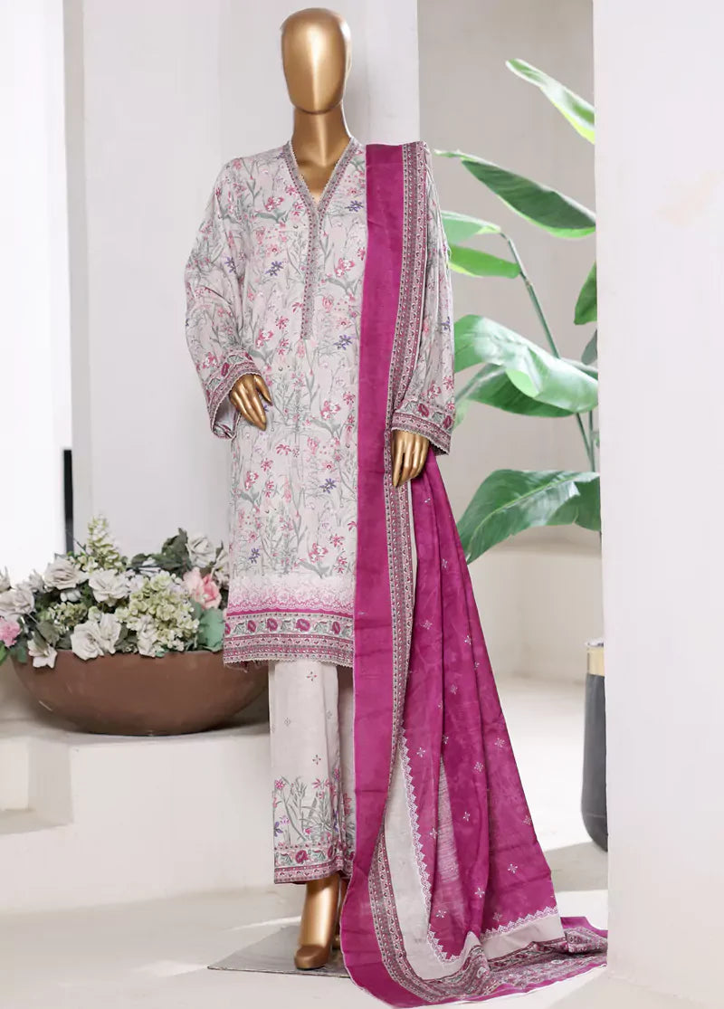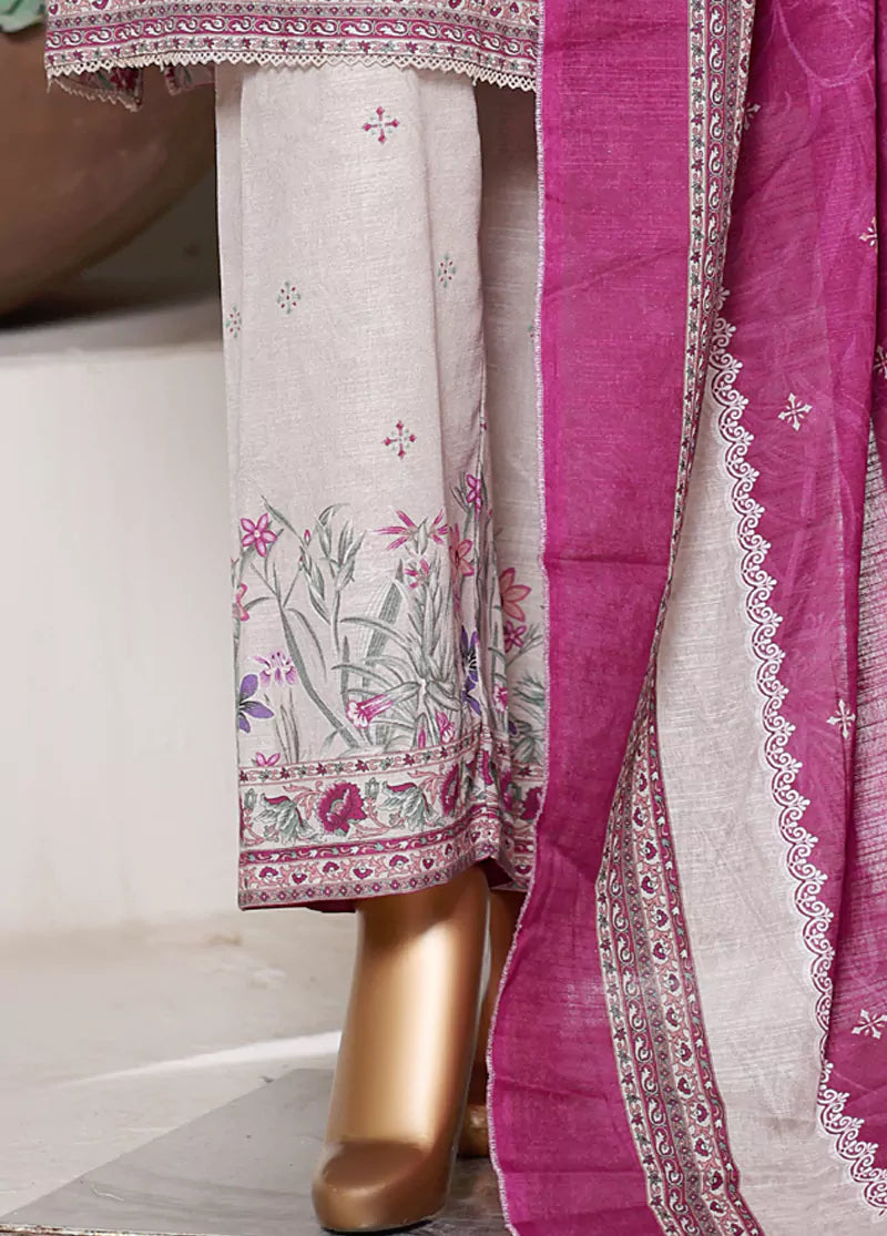 Bin Saeed Fabrics presents a women's 3 Piece Stitched Printed Suit featuring a long shirt, culottes, and dupatta, all crafted from comfortable Khaddar fabric. The multi-color ensemble includes delicate lace work embellishments, offering a breathable and stylish option perfect for Pakistan’s cooler seasons.