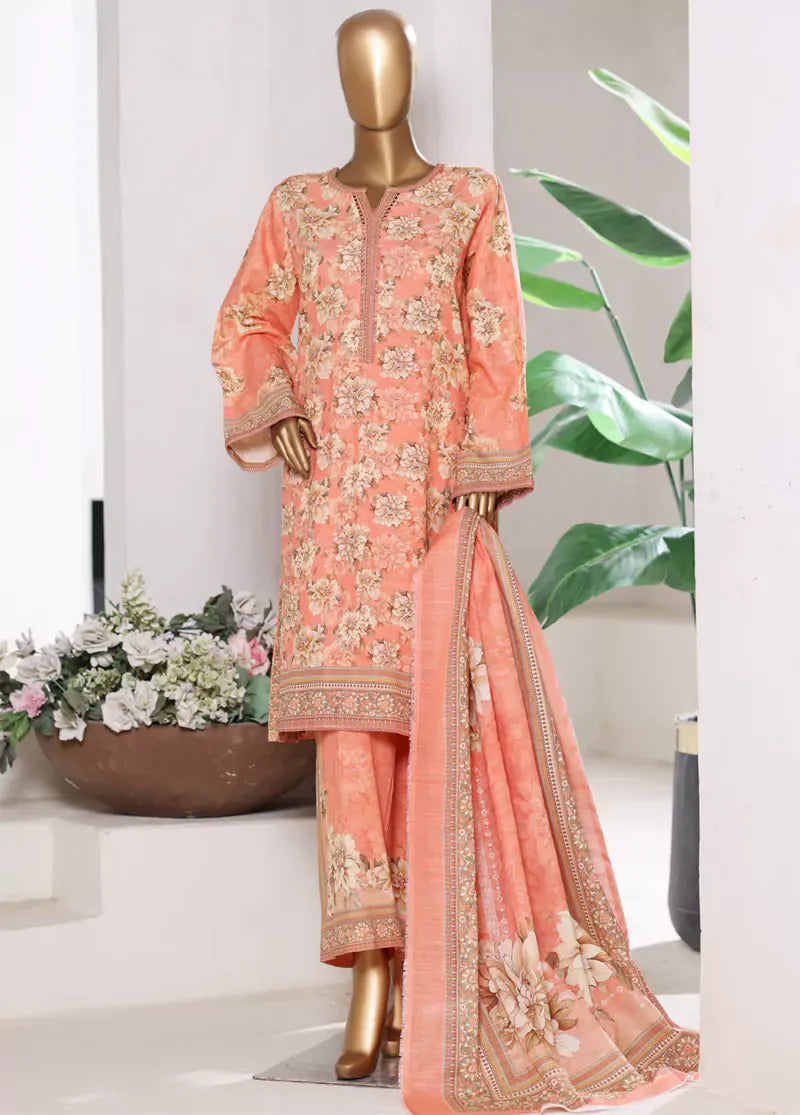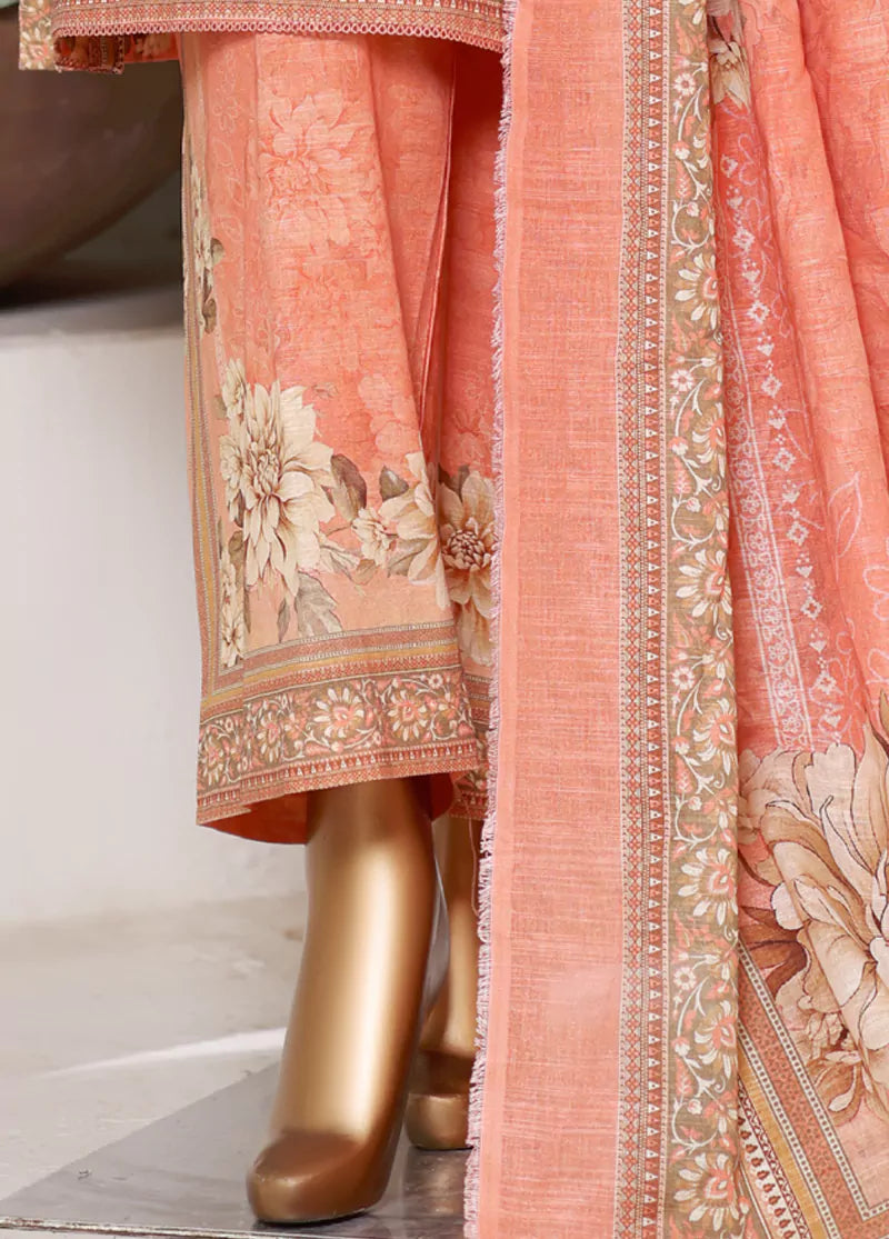 Bin Saeed Fabrics presents a women's 3 Piece Stitched Printed Suit in soft peach, crafted from breathable Khaddar fabric. This long shirt with lace embellishment pairs perfectly with matching culottes and a lightweight dupatta, offering comfortable wear ideal for cooler seasons while maintaining a stylish, modest look.