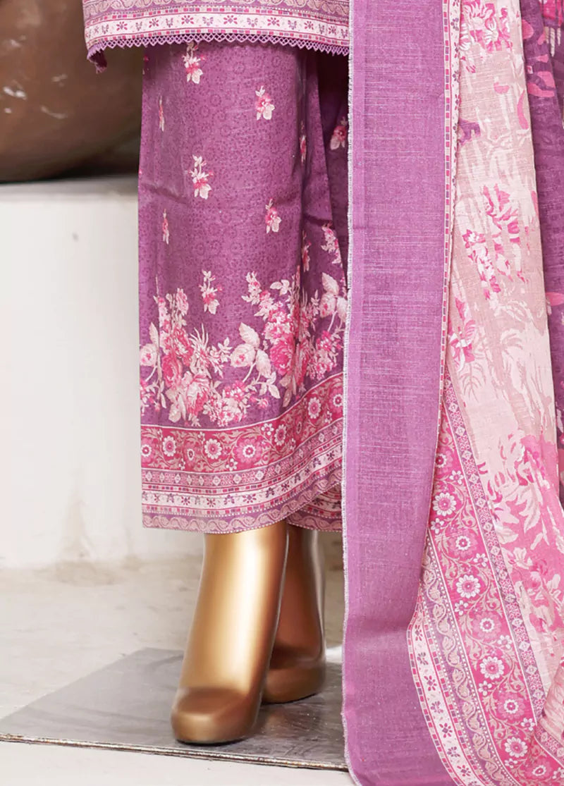 Bin Saeed Fabrics presents a women's 3 Piece Stitched Printed Suit in soothing muave, crafted from breathable khaddar fabric. This long shirt with lace work, paired with matching culottes and a muave dupatta, offers comfortable wear ideal for cooler seasons, blending style and ease effortlessly.